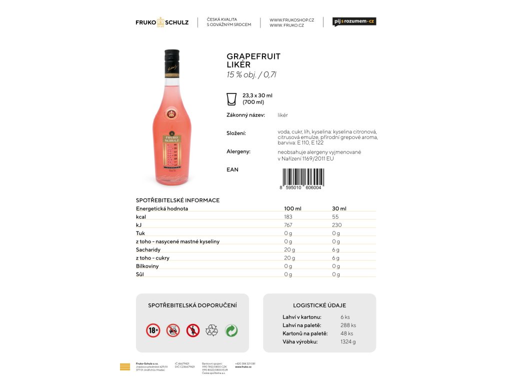 | Složení: | voda, cukr, líh, kyselina citronová, citrusová emulze, přírodní grepové aroma, barviva: E 110, E 122 |