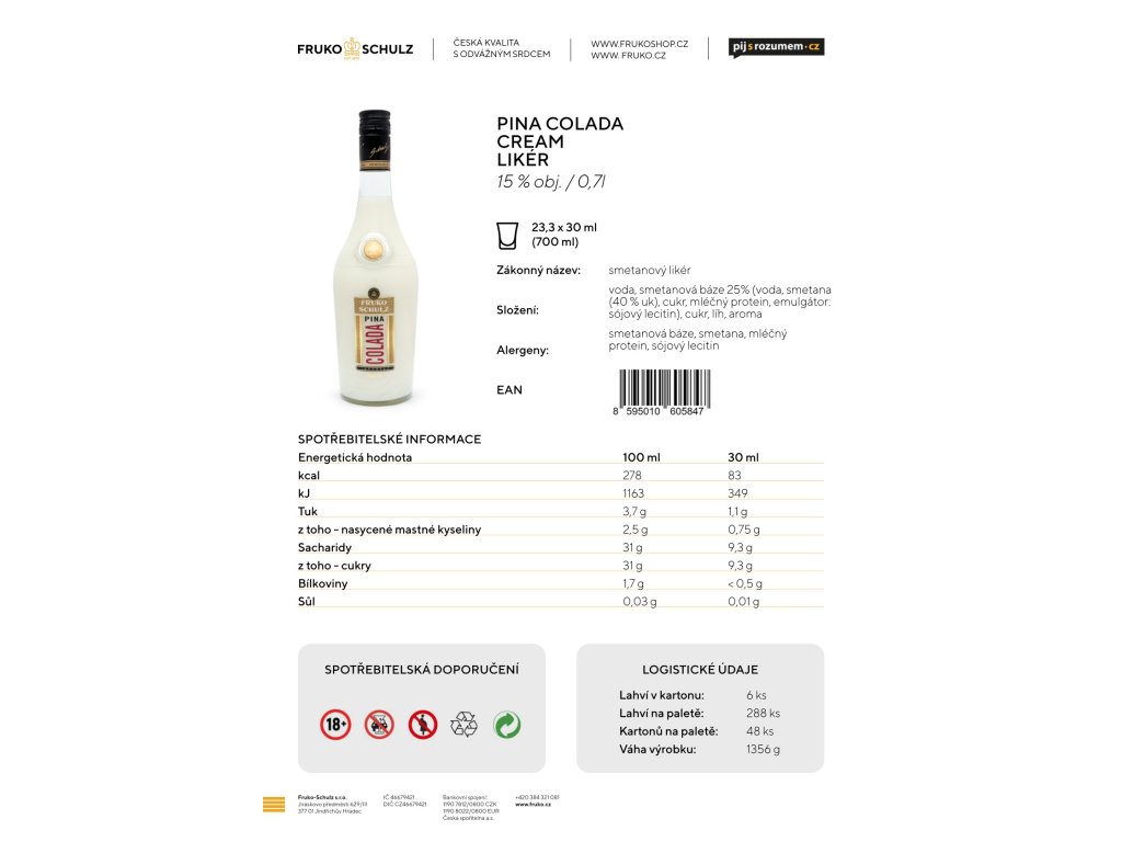 Likér FRUKO SCHULZ Pina Colada je inspirován světoznámým koktejlem, který si získal popularitu v 80. letech 20. století. Tento krémový likér s 15 % obsahem alkoholu obsahuje smetanu. Díky své svěží chuti je výborným základem pro koktejly s exotickým ovocem i k samostatnému popíjení.