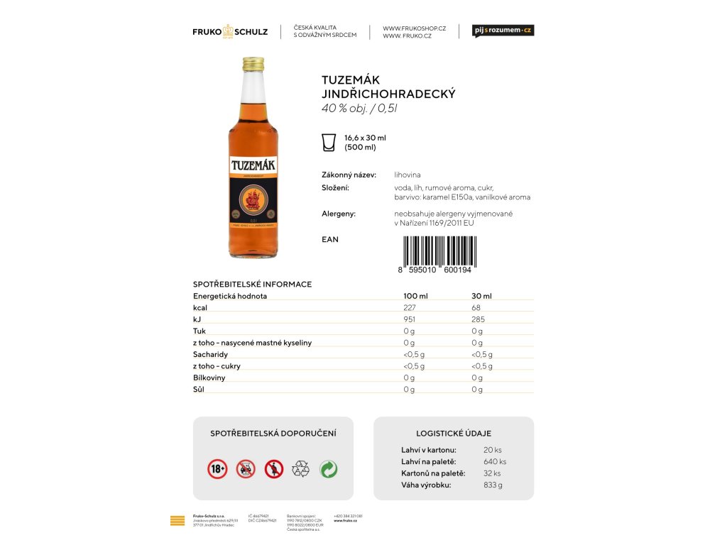 Přeneste se do časů našich babiček s poctivým Tuzemákem z Jindřichova Hradce. Tento tradiční český alkoholický nápoj, s obsahem alkoholu 40 %, je vyráběn podle osvědčené receptury z kvalitních surovin. Jeho jemná, lehce nasládlá chuť s tóny karamelu a charakteristická vůně ho předurčují k širokému využití.