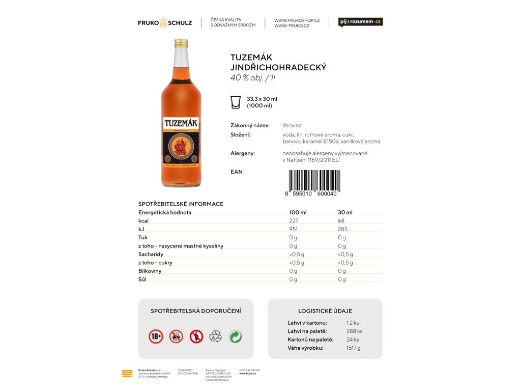 Přeneste se do časů našich babiček s poctivým Tuzemákem z Jindřichova Hradce. Tento tradiční český alkoholický nápoj, s obsahem alkoholu 40 %, je vyráběn podle osvědčené receptury z kvalitních surovin. Jeho jemná, lehce nasládlá chuť s tóny karamelu a charakteristická vůně ho předurčují k širokému využití.