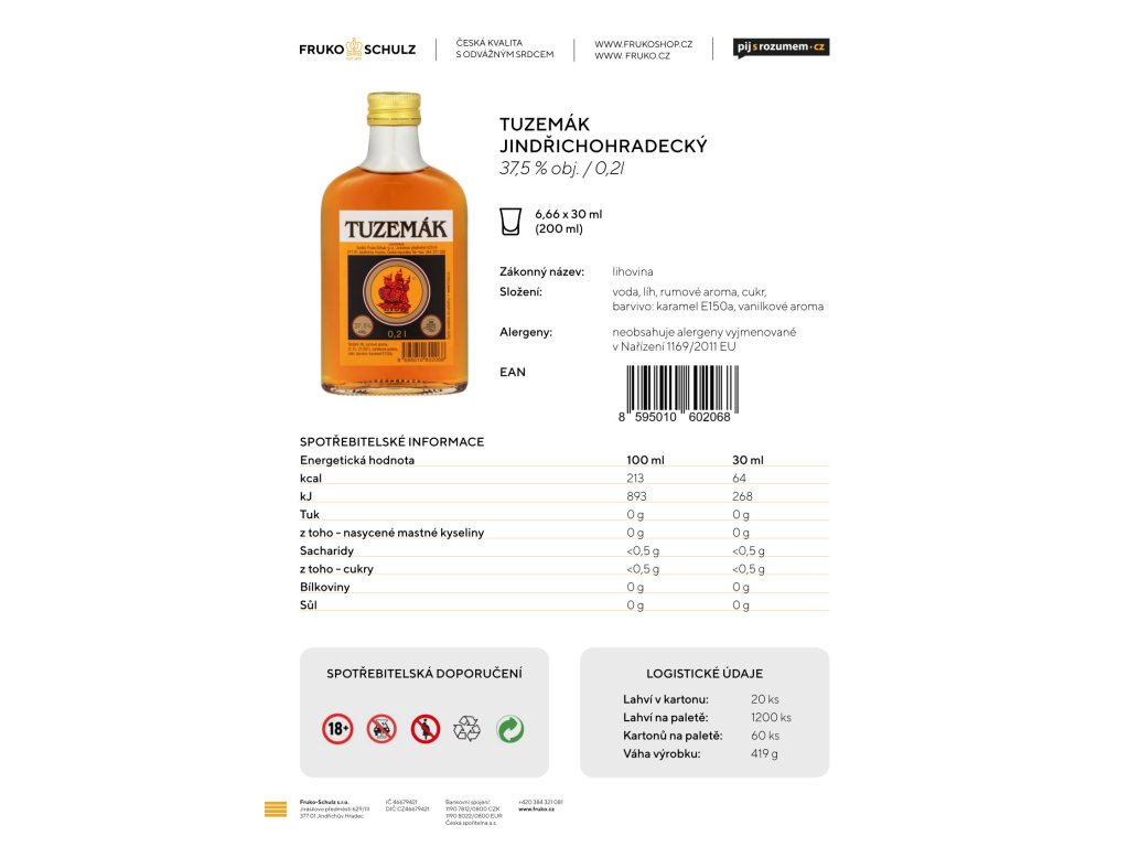 Přeneste se do časů našich babiček s poctivým Tuzemákem z Jindřichova Hradce. Tento tradiční český alkoholický nápoj, s obsahem alkoholu 37,5 %, je vyráběn podle osvědčené receptury z kvalitních surovin. Jeho jemná, lehce nasládlá chuť s tóny karamelu a charakteristická vůně ho předurčují k širokému využití.